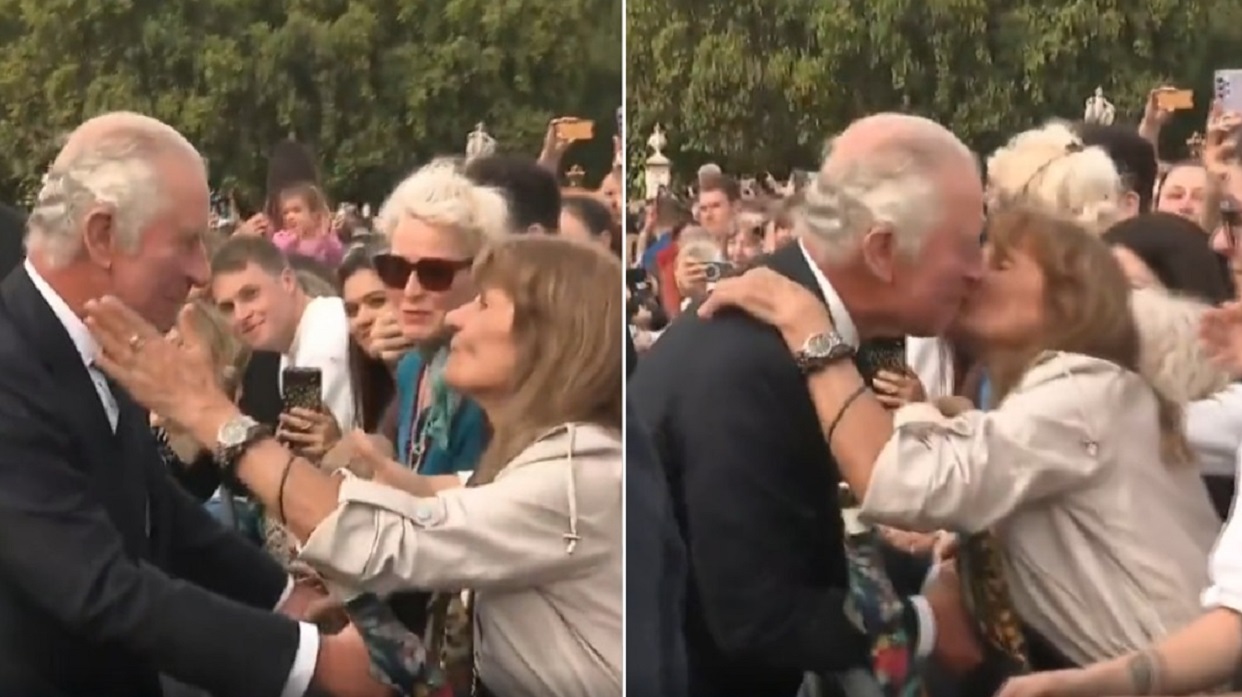 Rey Carlos III recibió inesperado beso de una mujer que rompió el protocolo afuera del Palacio de Buckingham
