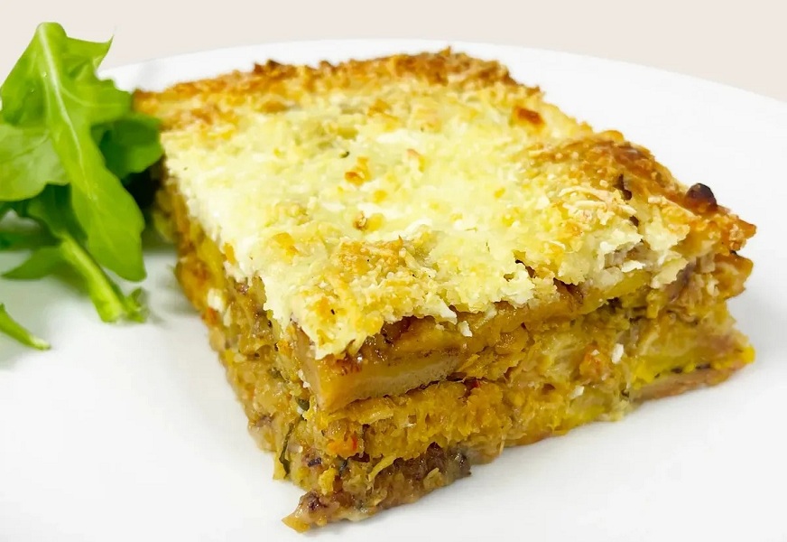 Este plato utiliza capas de tajadas de plátano maduro, guiso de pescado desmenuzado y queso.El cazón es la proteína principal en esta receta, aunque otras especies similares funcionan para su elaboración.