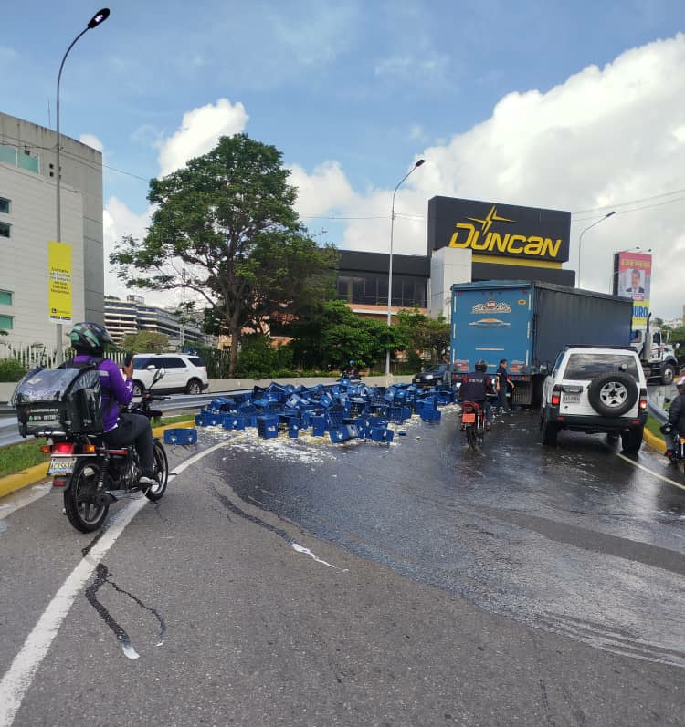 Reportan derrame de cajas de cervezas de una gandola en el distribuidor Los Ruices