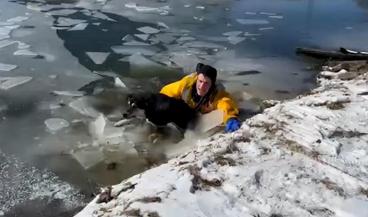 Espectacular rescate: Un perro es salvado de las aguas congeladas de un estanque de Missouri (+Video)