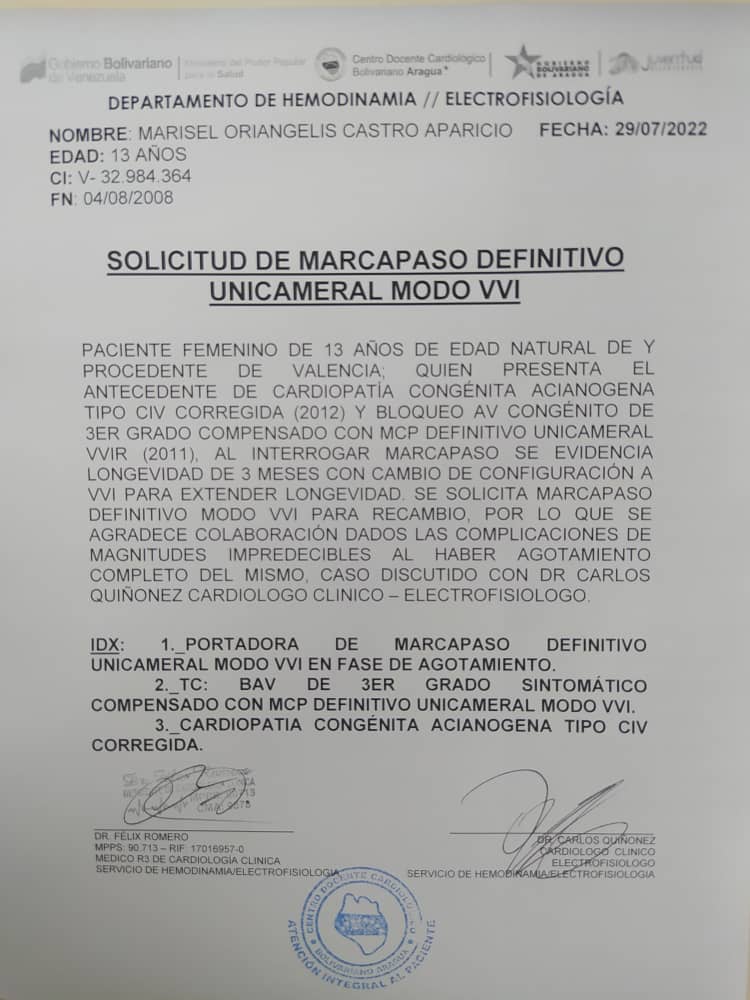 Marisel Oriangelis Castro Aparicio con Antecedentes de Cardiopatía Congénita Acianoagena tipo CIV Corregida (2012) y Bloqueo AV Congénita de tercer grado,
