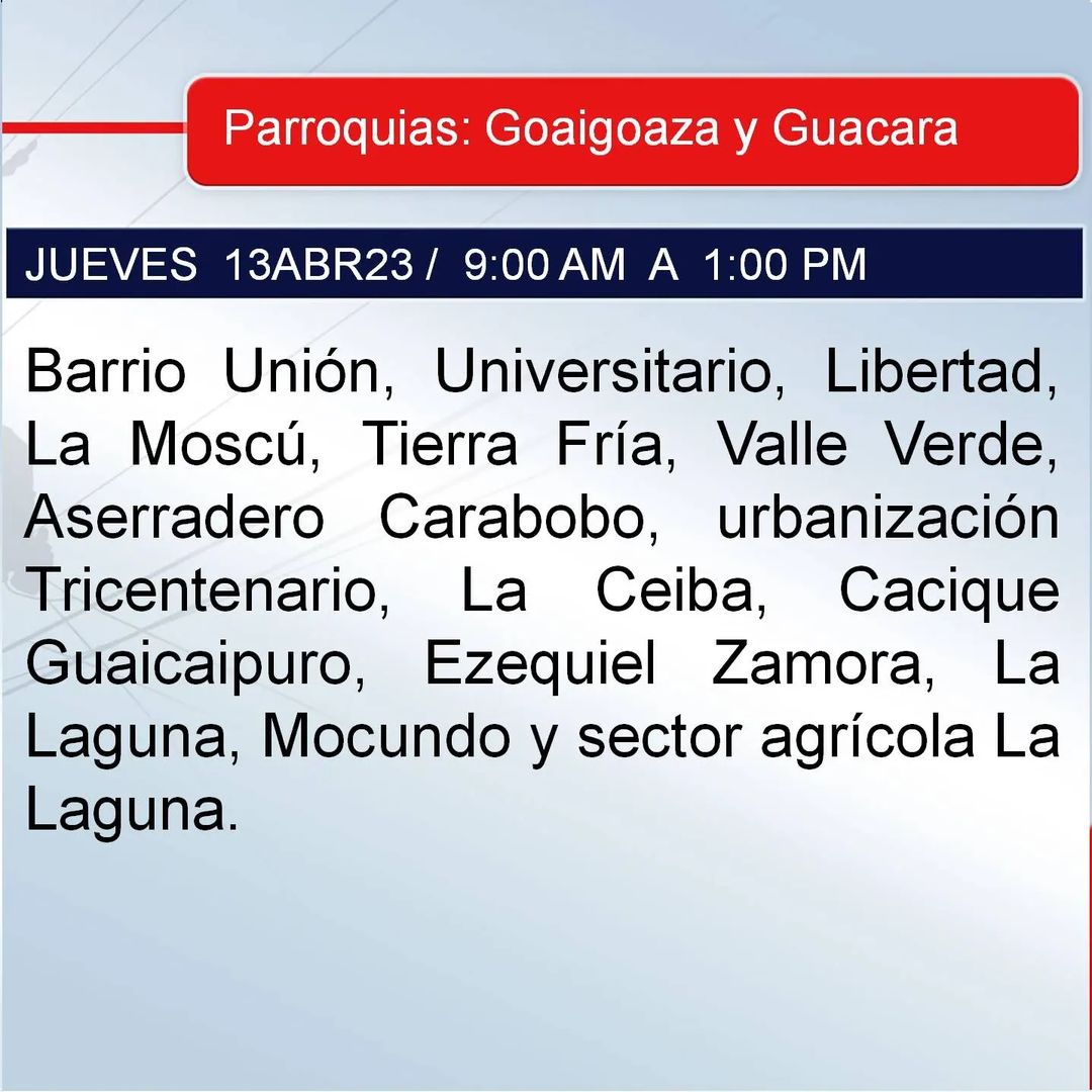 Carabobo.- La Corporación Eléctrica Nacional en Carabobo (Corpoelec) anunció corte de electricidad por mantenimiento programado para este jueves 12 de abril en los municipios Guacara y Puerto Cabello.