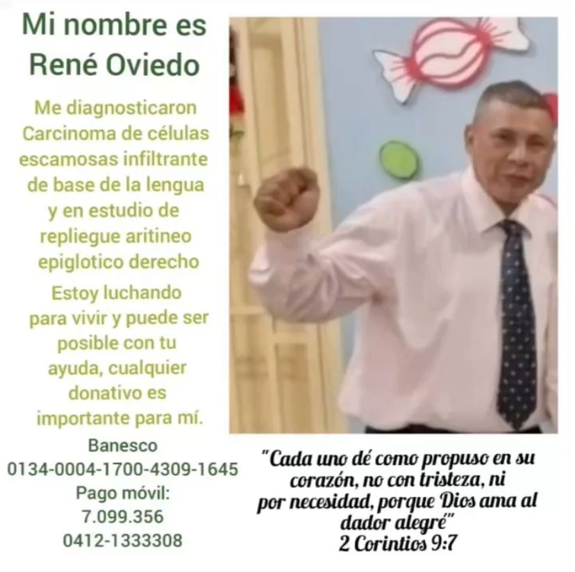Servicio Público.- El señor René Oviedo fue diagnosticado con carcinoma de células escamosas infiltrante de base de la lengua y en estudio de repliegue aritineo epiglotico derecho y continúa necesitando la ayuda de todos para combatir esta enfermedad.