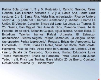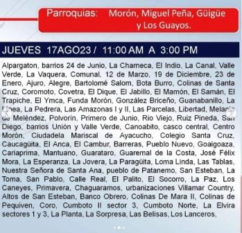 De acuerdo a su publicación en la cunta de Instagram, el corte iniciará a las 11: 00 am y se prolongará hasta las 3:00 pm en los municipios de Valencia, Carlos Arvelo, Los Guayos y Juan José Mora.