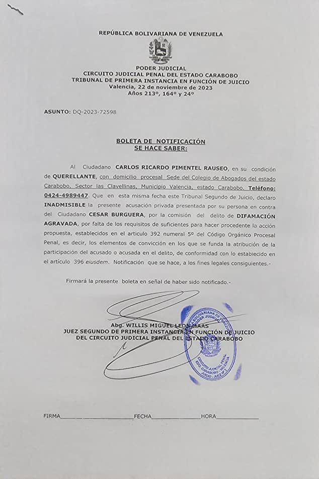 Circuito Judicial Penal del estado Carabobo a través del Tribunal de Primera Instancia en Función de Juicio declaró inadmisible la acusación, por presunta difamación, presentada por