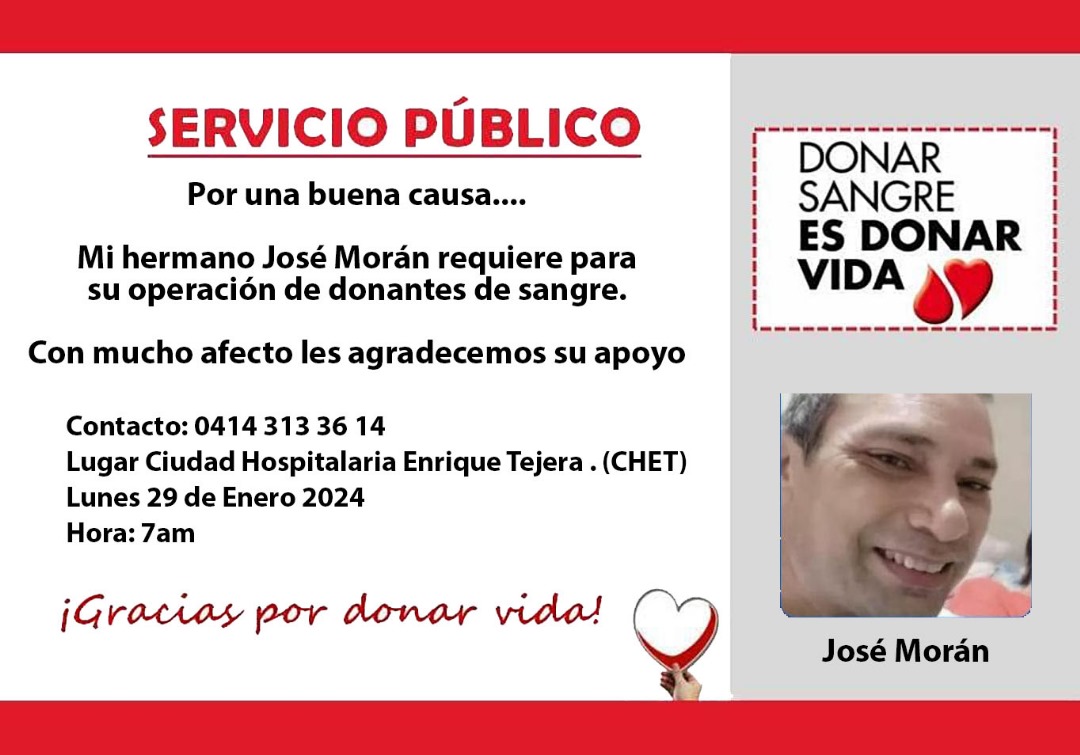 Servicio Público: José Morán necesita donantes de sangre
