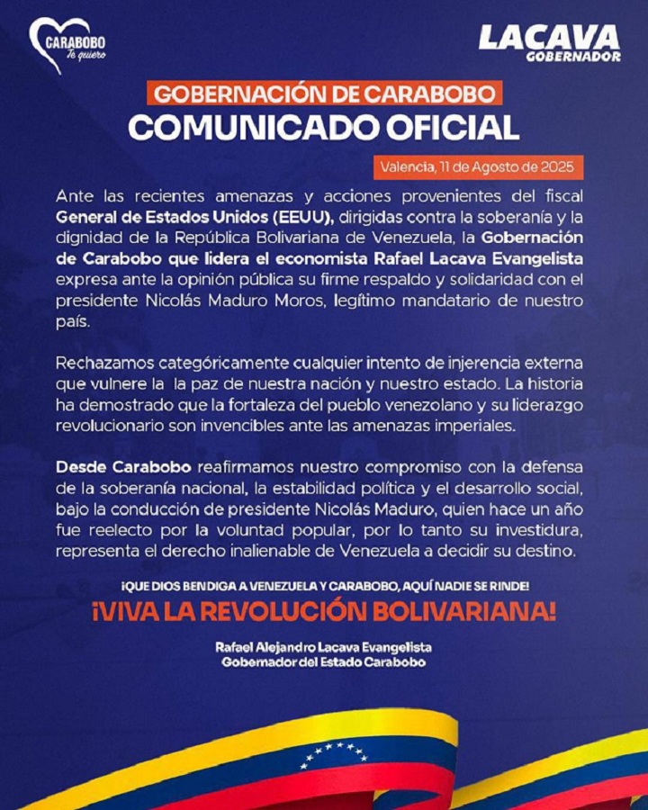“Desde Carabobo alzamos nuestra voz para respaldar con firmeza a nuestro presidente legítimo Nicolás Maduro frente a las amenazas del imperialismo. Aquí no nos arrodillamos ante nadie, seguimos defendiendo la soberanía, la paz y el futuro de Venezuela con la fuerza invencible de nuestro pueblo. Leales siempre, traidores nunca. Aquí nadie se rinde. Que viva Carabobo”, expresó Lacava.