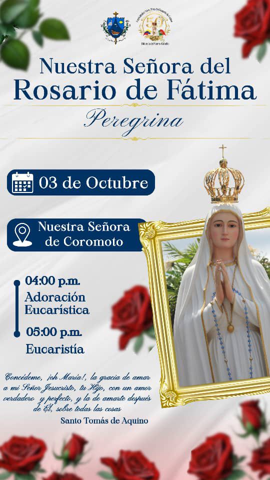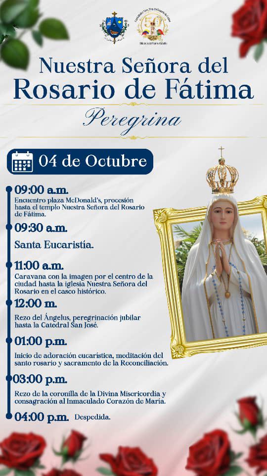 Carabobo.- La Diócesis de Puerto Cabello se viste de gala y fervor para un evento histórico: la visita de la imagen peregrina de Nuestra Señora del Rosario de Fátima, directamente desde Cova da Iría, Portugal. La jornada central, llena de actos de profunda devoción, se llevará a cabo el próximo viernes 4 de octubre.
