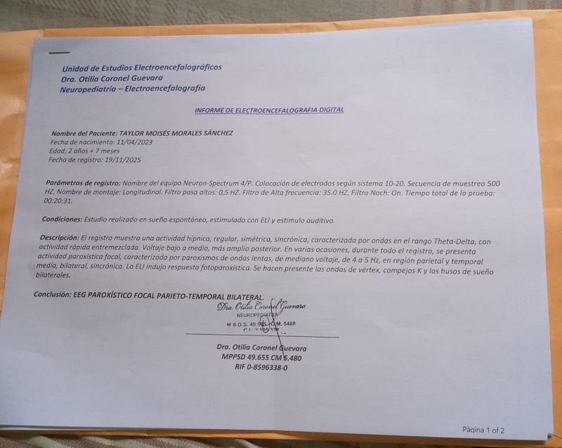 Taylor ha sido diagnosticado con Epilepsia Infantil y actualmente presenta un cuadro de anemia (hemoglobina en 10), lo que complica su estado de salud. Su familia ha costeado con mucho esfuerzo los estudios iniciales, pero necesitan ayuda urgente para continuar con su tratamiento y diagnóstico.