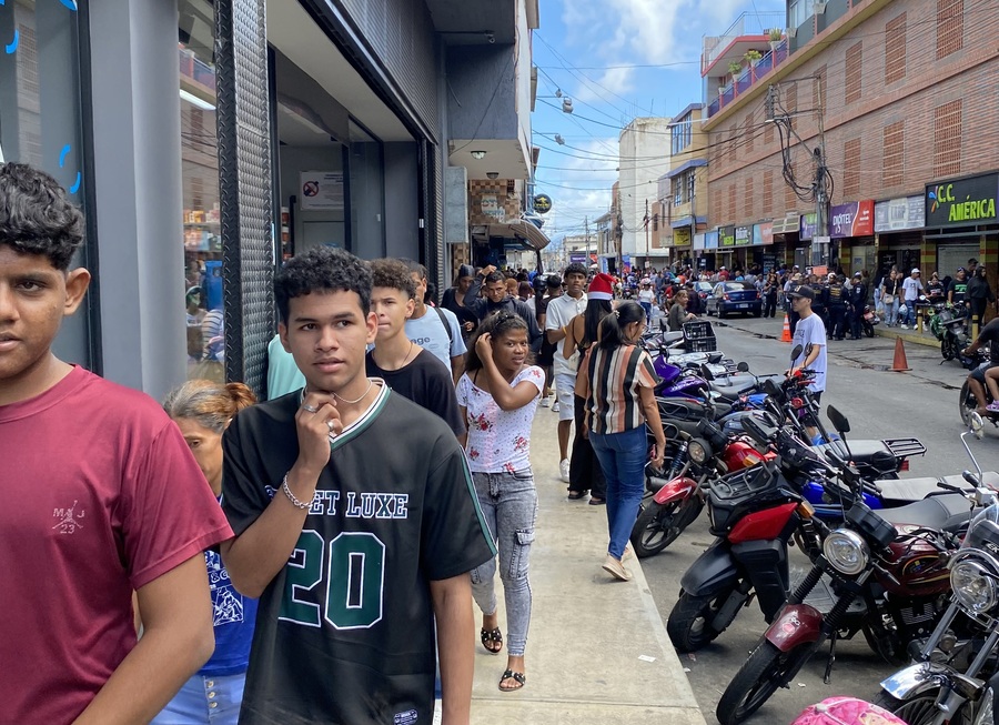 La música navideña que suena desde los parlantes de las tiendas crean una atmósfera de festividad que contrasta con el ajetreo de los transeúntes.