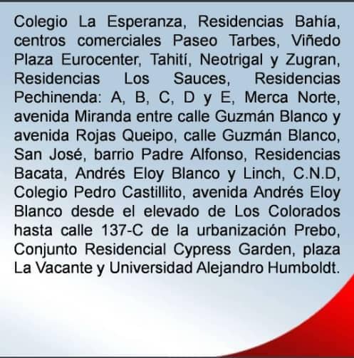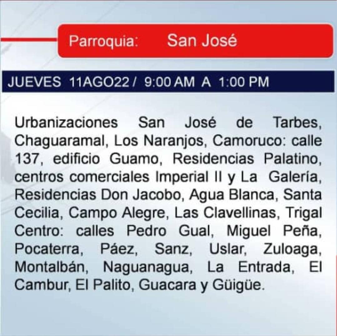 cortes de luz programados por mantenimiento desde las 9:00 am hasta 1:00 pm en los municipios Valencia, Guacara y NaguanaguaEntre las zonas afectadas por los cortes eléctricos, están: la urbanización San José de Tardes, Chaguaramal, Los Naranjos, Camoruco,, Guamo, residencias Palatino, centro comerciales Imperial II y la Galeria, Residencias Don Jacobo, Agua Blanca, Santa Cecilia, Campo Alegre, Las Clavellina, Trigal, entre otros.
