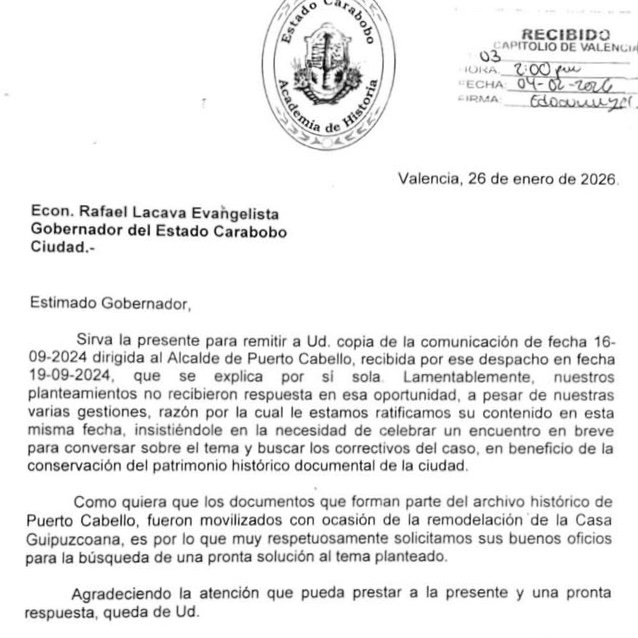 Ante la falta de respuesta a gestiones previas iniciadas en septiembre de 2024, la Academia ha remitido una copia de la situación al gobernador del estado, Rafael Lacava, solicitando su mediación. "Continuamos insistiendo por un encuentro para conversar sobre el archivo. Esperamos (...) respuesta en beneficio del patrimonio histórico - documental de los porteños", expresó Sabatino.