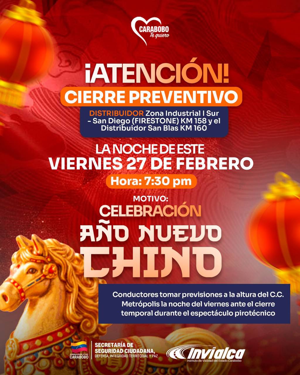 Carabobo.- La Gobernación del estado Carabobo anunció que se realizará un cierre preventivo de diversos tramos de la Autopista Regional del Centro (ARC) en horas de la noche de este viernes 27 de febrero por la celebración del Año Nuevo Chino.