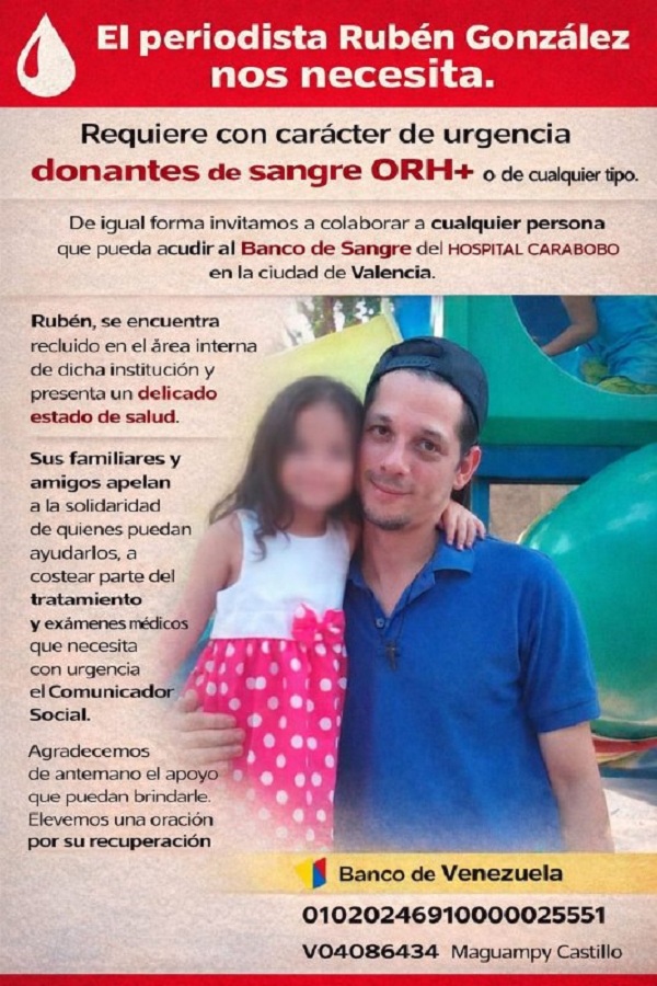 Carabobo.- El periodista Rubén González necesita tus manos amigas, debido a que requiere con urgencia donantes de sangre ORH+ o de cualquier tipo, las personas pueden dirigirse al Banco de Sangre del Hospital Carabobo, en Valencia.