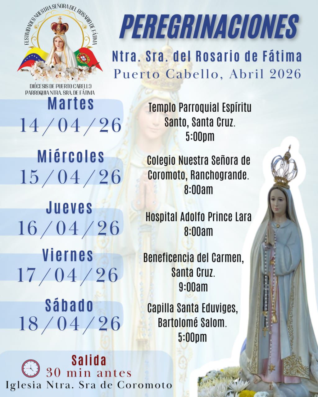 Carabobo.- Los feligreses católicos porteños darán inicio a las peregrinaciones de Nuestra Señora del Rosario de Fátima en la "ciudad cordial". El evento, coordinado por el comité de las Festividades de Fátima en Puerto Cabello, llevará la imagen de la Virgen a diversos puntos clave de la comunidad durante esta semana de abril bajo un recorrido estratégico que busca llevar un mensaje de esperanza y unión, especialmente a centros asistenciales y sectores populares.