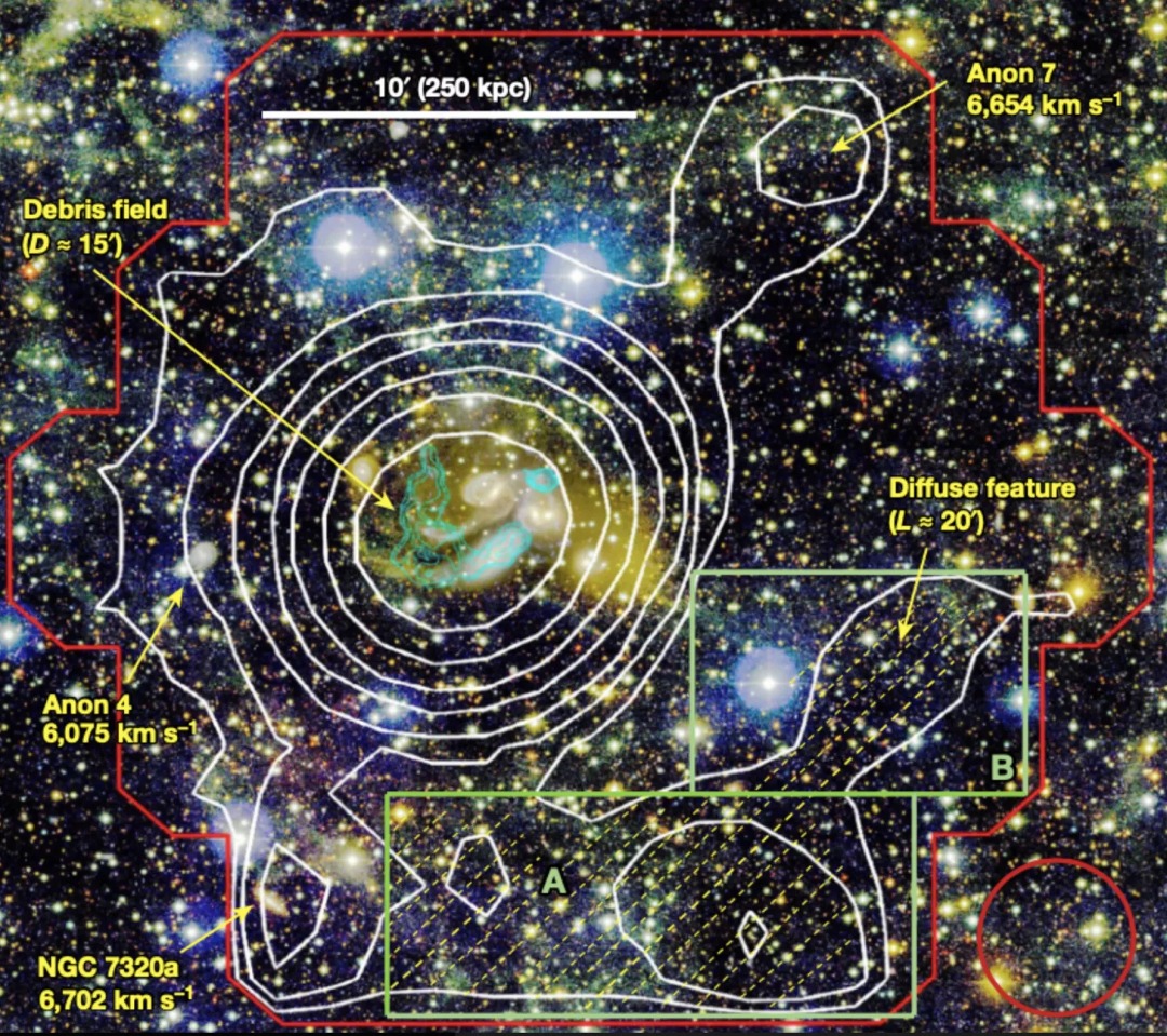 La ubicación de la enorme nube de gas atómico, está relativamente lejos del corazón del Quinteto de Stephan