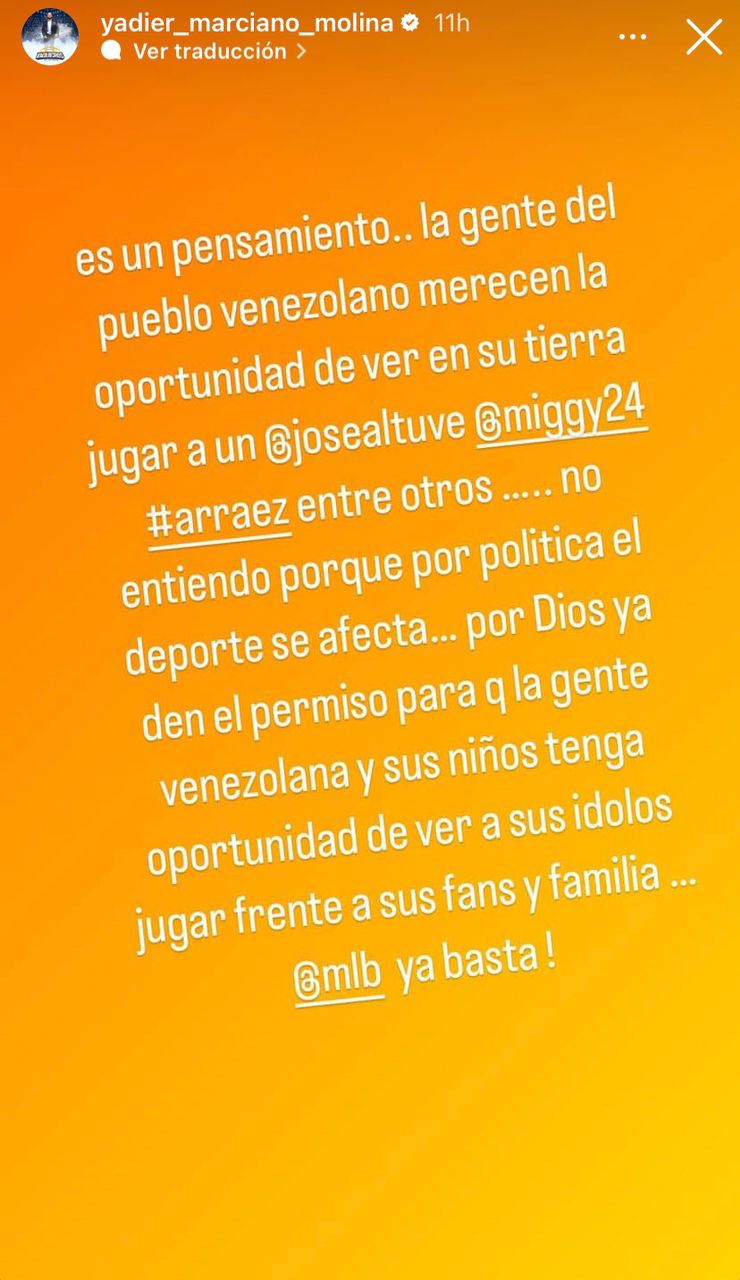 Además, Molina replicó el deseo de muchos fanáticos de la pelota venezolana, que sueñan con volver a ver a figuras de las Grandes Ligas que tienen varios años sin jugar en la LVBP. “El pueblo venezolano merece la oportunidad de ver jugar en su tierra a José Altuve, Miguel Cabrera, Luis Arráez, entre otros”, comentó.