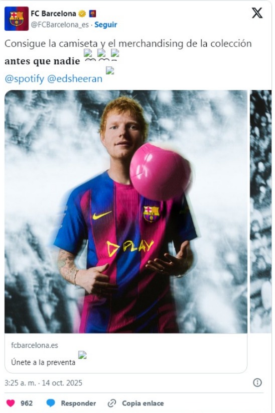 "Spotify y el FC Barcelona regresan con su séptima camiseta especial, y el artista que aparecerá en ella será Ed Sheeran, lo que supone la primera vez que un artista masculino de pop en solitario protagoniza la camiseta. Durante El Clásico del 26 de octubre, los jugadores del FC Barcelona llevarán una versión de la icónica camiseta blaugrana con el logotipo del último álbum de estudio de Ed Sheeran, Play... Al colocar Play en la parte frontal de la camiseta, esta colaboración destaca el poder de la música para trascender fronteras y unir a las personas.", dio a conocer la plataforma musical.