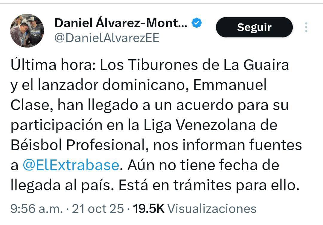 Deportes.- Los Tiburones de La Guaira contará con la presencia del lanzador dominicano, Emmanuel Clase, para la temporada 2025-2026 de la Liga Venezolana del Béisbol Profesional (LVBP), tras no poder participar en la Lidom.