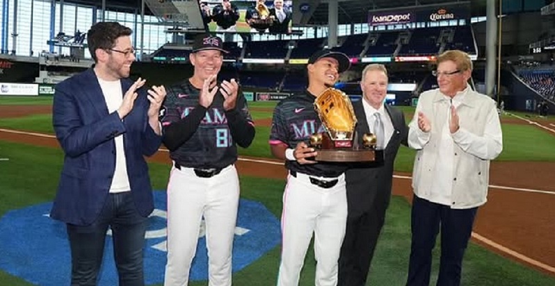 Tras un debut impecable de temporada, con 3-3 en su primer compromiso, y antes de dar inicio al encuentro entre los Marlins de Miami y los Rockies de Colorado en el LoanDepot Park, la gerencia del equipo local y familiares de Sanoja lo acompañaron a levantar el galardón.