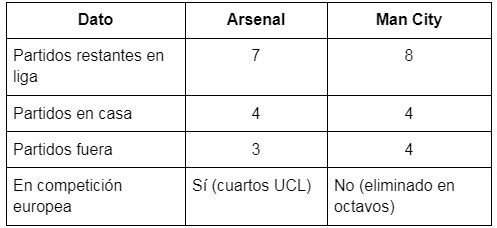 El calendario cruzado puede hacer que el colchón de puntos se sienta más estrecho de lo que parece. Arsenal sigue en cuartos de la Champions League contra Sporting CP, con ida el 7 de abril y vuelta el 15, apenas cuatro días antes de la visita al Etihad. También tienen cuartos de la FA Cup el 4 de abril.