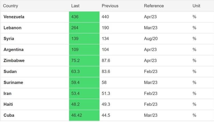 De acuerdo con el ranking “Inflation Rate” de Trading Economics, el primer lugar de los países con el aumento de precios más fuerte lo encabeza Venezuela, con un aumento del 436 %. A esta le siguen Líbano (264 %), Siria (139 %), Argentina (109 %) y Zimbabwe (75,2 %). Estas cinco son las naciones con el costo de vida más caro del mundo y no es un secreto para nadie que muchas de estas enfrentan una seria crisis económica.