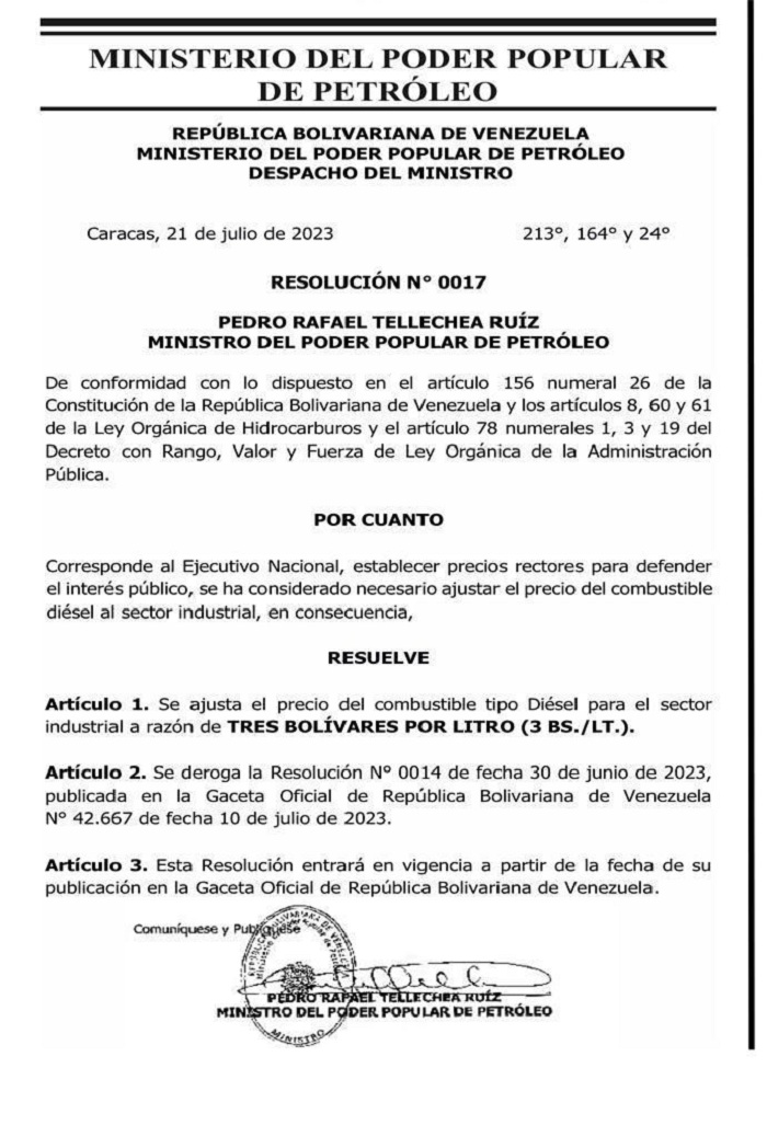 La resolución número 0017, del Ministerio del Petróleo, precisó que el costo del litro de diésel para el sector industrial a razón de 3 bolívares por litro, equivalente a 0,10 dólares al tipo de cambio oficial.