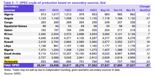 Economía.- La Organización de Países Exportadores de Petróleo (Opep), publicó su Boletín Mensual del Mercado Petrolero correspondiente a noviembre 2023, donde indicó que la producción de Venezuela fue 780 mil barriles por día (mb/d), según las fuentes independientes o secundarias.