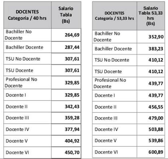 Un docente VI cobra mensualmente Bs. 600,89 o US$ 16,67 por trabajar 53,33 horas a la semana, mientras que un bachiller docente gana Bs. 383,23 o US$ 10,63.