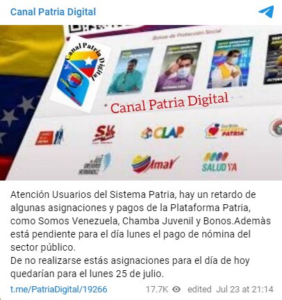 “De no realizarse estás asignaciones para el día de hoy quedarían para el lunes 25 de julio” indicó el Canal Patria Digital.