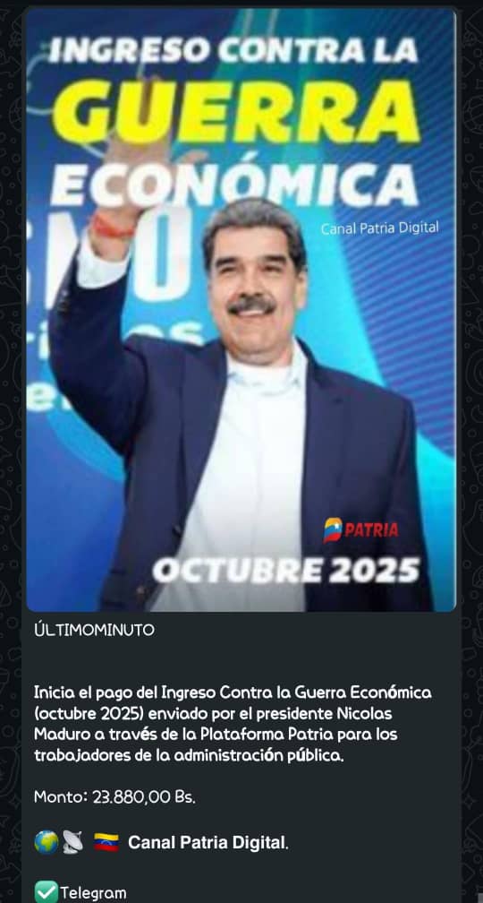Economía.- El Gobierno nacional a través del Sistema Patria, comenzó este miércoles 15 de octubre con la activación del pago del "Ingreso Contra la Guerra Económica", establecido para el personal de la administración pública.