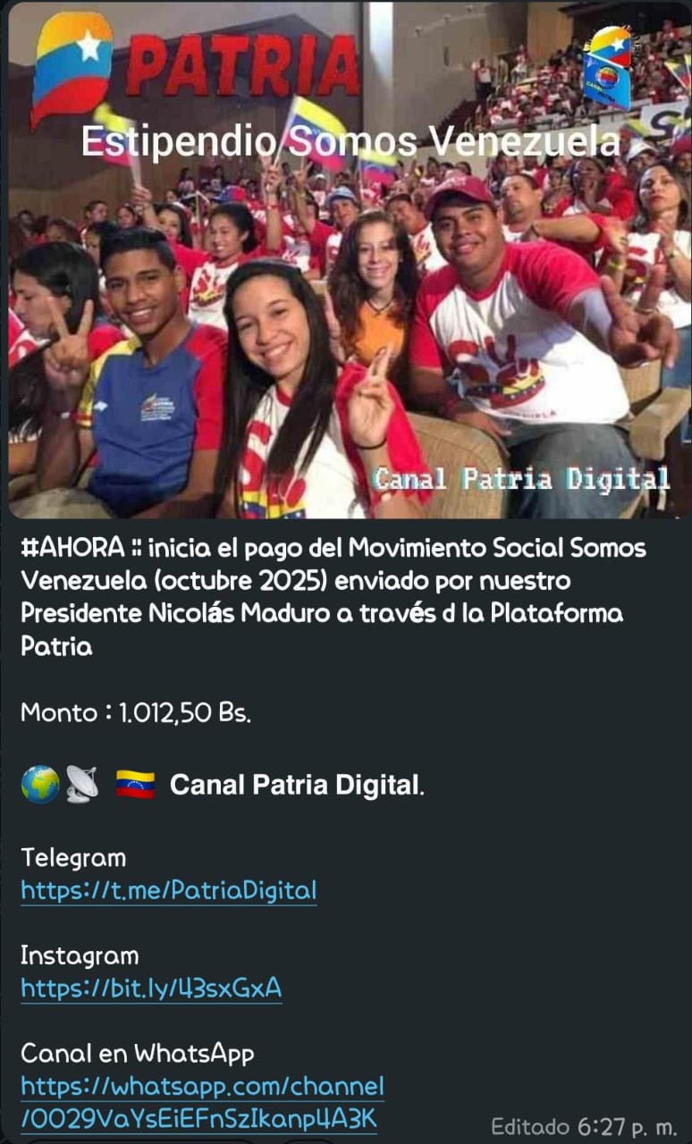 Economía.- El Gobierno nacional a través del Sistema Patria, inició la cancelación del bono "Movimiento Somos Venezuela", dirigido a los ciudadanos inscritos en el referido programa.