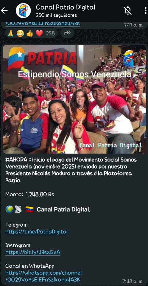 Economía.- Este martes 18 de noviembre, inició la entrega del bono "Movimiento Social Somos Venezuela", dirigido a los miembros de la referida asociación, por la plataforma Patria.