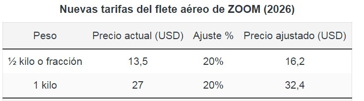 ZOOM explicó que más del 80% de los costos del servicio están denominados en dólares, lo que obliga a revisar las tarifas con frecuencia. El ajuste contempla un incremento del 20% en el flete aéreo.