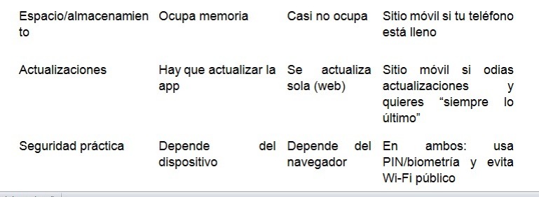 ● Sitio móvil: no requiere instalación, se abre en segundos y siempre está actualizado desde el navegador.