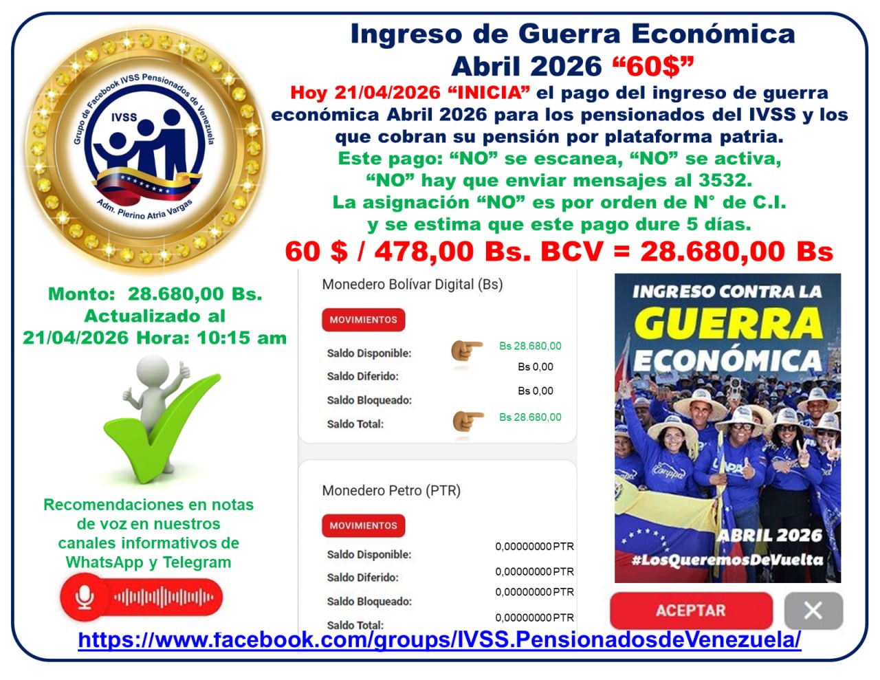 Economía.- Este martes 21 de abril, inicia el pago bono del Ingreso por Guerra Económica correspondiente al mes en curso, el cual va destinada a los pensionados del Instituto Venezolano de los Seguros Sociales (IVSS) y de la Misión 100% Amor Mayor.