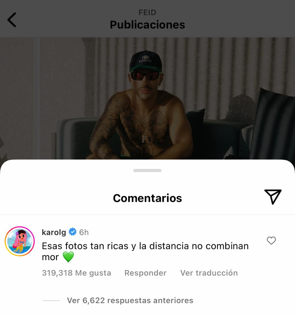 "Esas fotos tan ricas y la distancia no combinan mor", fue el comentario que le dejó Karol G al reggaetonero, acompañado con un emoji de corazón.