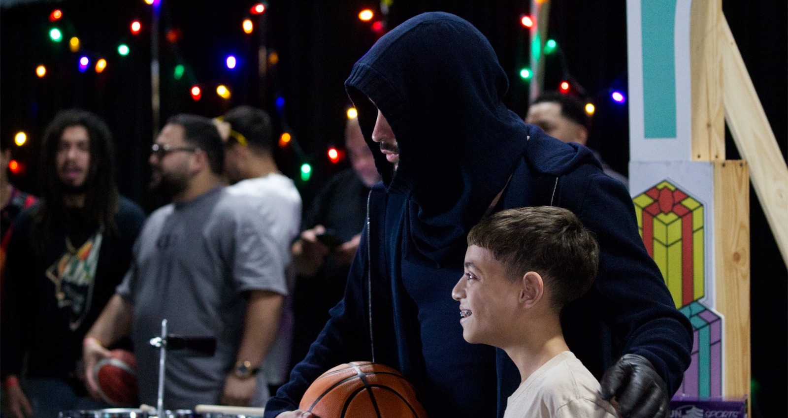 saludó primero a los niños con discapacidades especiales, brindándoles abrazos. Incluso cargó a uno de ellos y le entregó un canasto de baloncesto junto con una pelota.