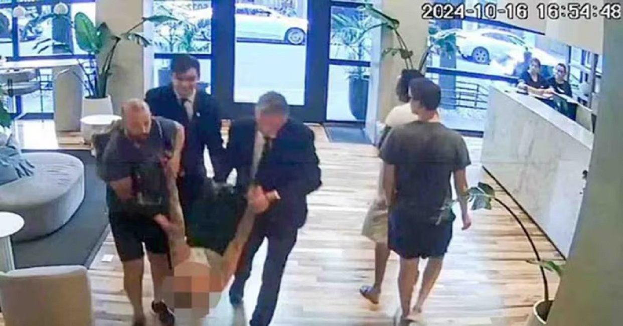 Imágenes revelan que el cantante fue cargado a la fuerza por tres empleados del hotel hacia su habitación