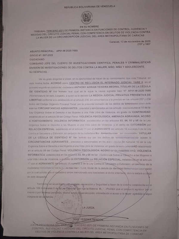 Espectáculos.- El Tribunal 3º de Control en Materia de Violencia Contra la Mujer dictó, este jueves 13 de noviembre, la privativa de libertad contra el reconocido animador y actor venezolano, Anthony Texeira, por presuntos delitos de violencia psicológica y extorsión.