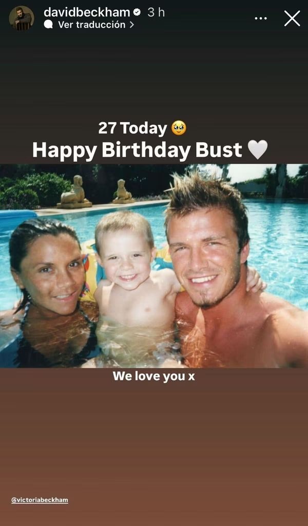 El exfutbolista del LA Galaxy compartió fotografías junto a su hijo, "27 años hoy", escribió, agregando un emoji con los ojos llorosos. "Feliz cumpleaños, Bust". En la imagen, Brooklyn aparece de bebé con sus padres, disfrutando en una piscina.