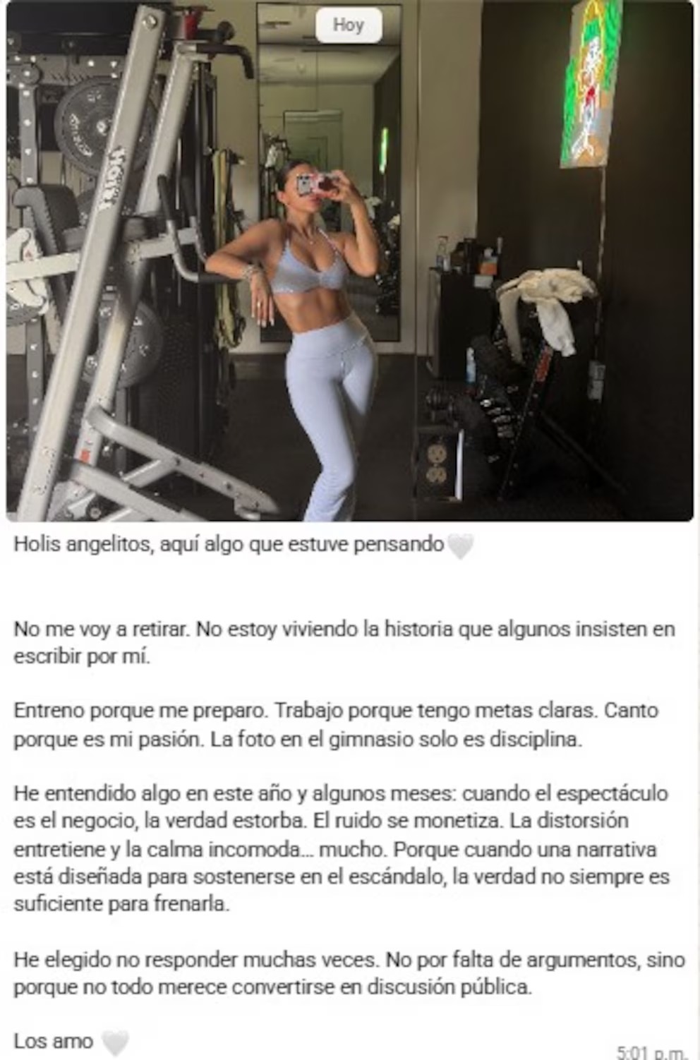 Explicó que las imágenes donde se la ve entrenando en el gimnasio han sido interpretadas fuera de contexto. “La foto en el gimnasio solo es disciplina”, aclaró en su mensaje, al tiempo que insistió en que su prioridad sigue siendo la música. La artista subrayó que no está viviendo “la historia que algunos insisten en escribir” sobre su vida profesional.