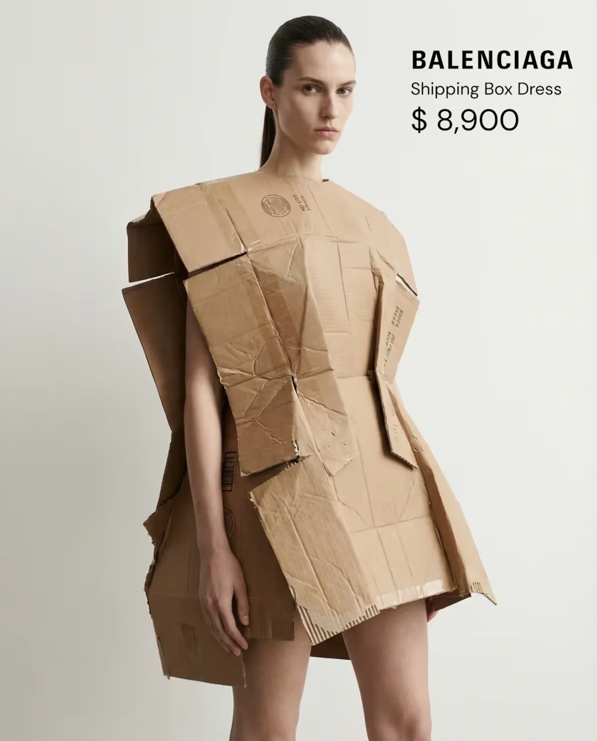 En este caso, el “cartón” deja de ser un material asociado al desecho para convertirse en una pieza conceptual, donde el valor no está en la materia prima, sino en la idea, la marca y la exclusividad.