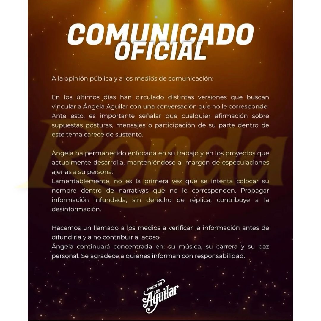"En los últimos días han circulado distintas versiones que buscan vincular a Ángela Aguilar con una conversación que no le corresponde", se puede leer en el comunicado.