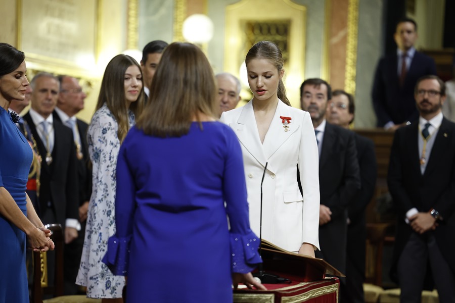 Con los parlamentarios puestos en pie, Leonor de Borbón ha leído el texto en el estrado presidencial del hemiciclo del Congreso ante la mirada de los reyes y de la infanta Sofía, del presidente del Gobierno en funciones Pedro Sánchez, y la del Congreso, Francina Armengol, situada enfrente al ser las Cortes Generales la receptora del juramento.