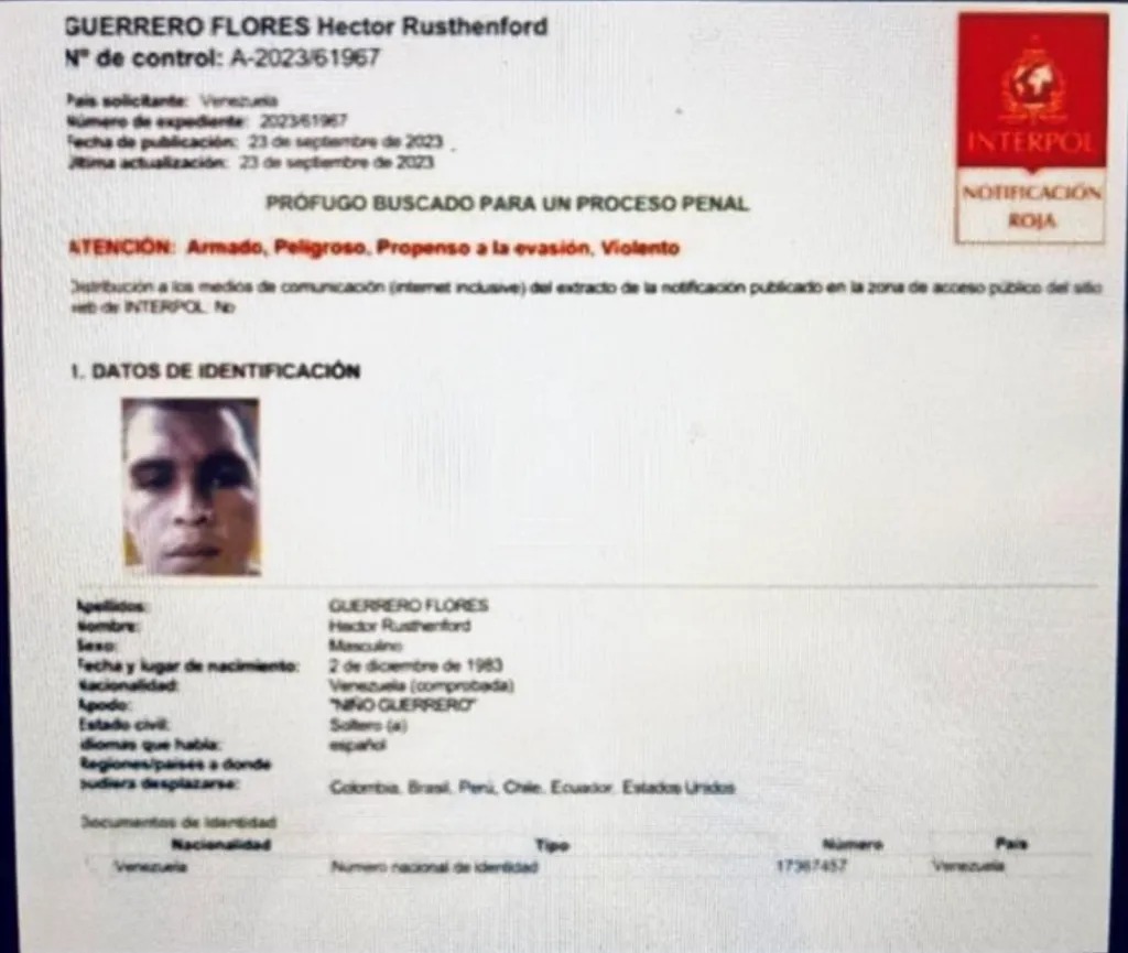 El 23 de septiembre de 2023 Interpol publicó una notificación roja contra Guerrero Flores, quien logró escapar de la cárcel de Tocorón, en Venezuela, antes de que este recinto fuera allanado por las autoridades locales el 20 de septiembre de 2023.