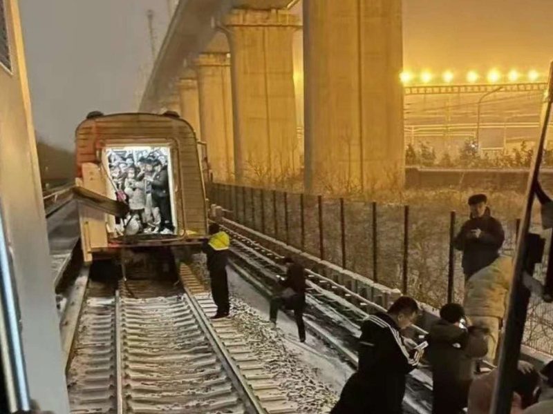 Imágenes compartidas en redes sociales muestran cómo algunos pasajeros tuvieron que evacuarse por las vías del sistema de trasporte en medio del frío y la nieve de la capital china. pic.twitter.com/P5RtTIEisZ