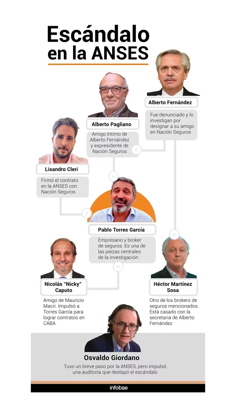Es en esa trama donde aparecen los nombres de Martínez Sosa, señalado como uno de los empresarios que se benefició con ese esquema de contrataciones por parte de los organismos públicos en una intermediación cuestionada. El mismo rol se le asigna a Torres García. Pagliano, en tanto, era el titular durante la presidencia de Alberto Fernández, de Nación Seguros. Todas son personas que mantienen algún vínculo con el ex presidente. La trama fue publicada por el periodista Ricardo Roa en Clarín.