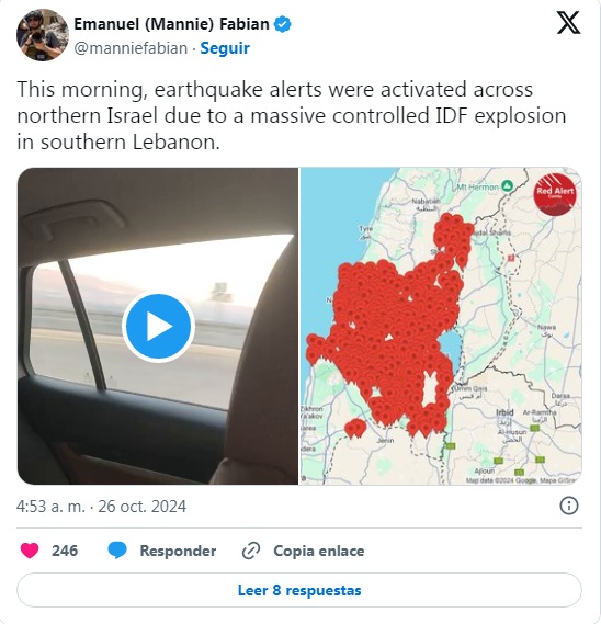 Internacional.- Las alertas de terremoto en el norte de Israel, se han activado luego que el ejército del país hebreo provocara una enorme explosión en el sur del Líbano a la hora de desmantelar "una instalación subterránea" presuntamente perteneciente al movimiento Hezbolá, este 26 de octubre.