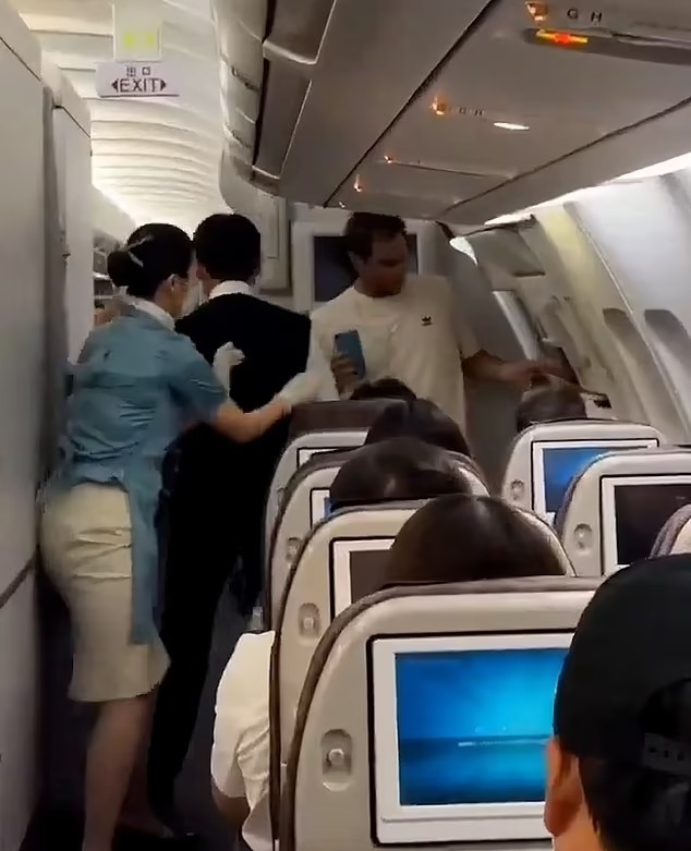 Las imágenes muestran a los asistentes de vuelo agarrando el pestillo de la puerta y luchando para detener al hombre mientras intenta abrirla. Los equipos pudieron sujetar al hombre, quien, según los informes, los había amenazado y actuado agresivamente, y lo llevaron a un área separada para calmarlo.